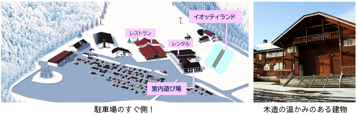 イオッティランドでそり遊び、雪遊びを楽しんだり、室内遊び場で汗だくになって楽しんだり、1日通してフルパワーで遊べます。お腹が空いたり、ソフトクリームを食べたくなったりしてもレストランが近くて便利!スキーやスノーボードをしたくなってもすぐ隣の施設がレンタルコーナーなので気軽にレンタルできます。お子さんとゆっくり時間を気にせずスキー場を満喫してくださいね