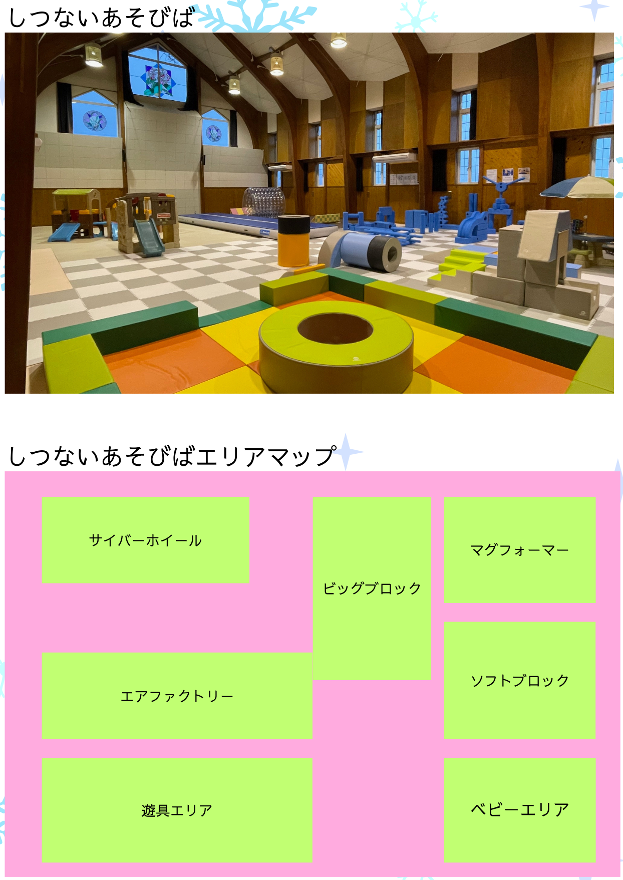利用の際のお願い ○親子で一緒に遊ぶ施設です。必ず保護者(18歳以上)が付き添ってください。お子様だけを遊び場に残さないでください ○安全のため、保護者1名様につき、お子様3名様までとさせていただきます ○施設利用上の安全管理は保護者様の責任となりますので、施設内ではお子様のそばを離れないようお願いいたします ○途中で具合が悪くなったお子様には、途中退場をお願いする場合があります。医務室はありませんのでお車でお休みください ○施設内における事故・トラブルにつきましては一切の責任を負いかねますので予めご了承ください ○施設内でご自身のお子様の撮影を行うことは可能ですが、SNSなどに掲載される場合は他のお客様へのご配慮をお願いいたします |
