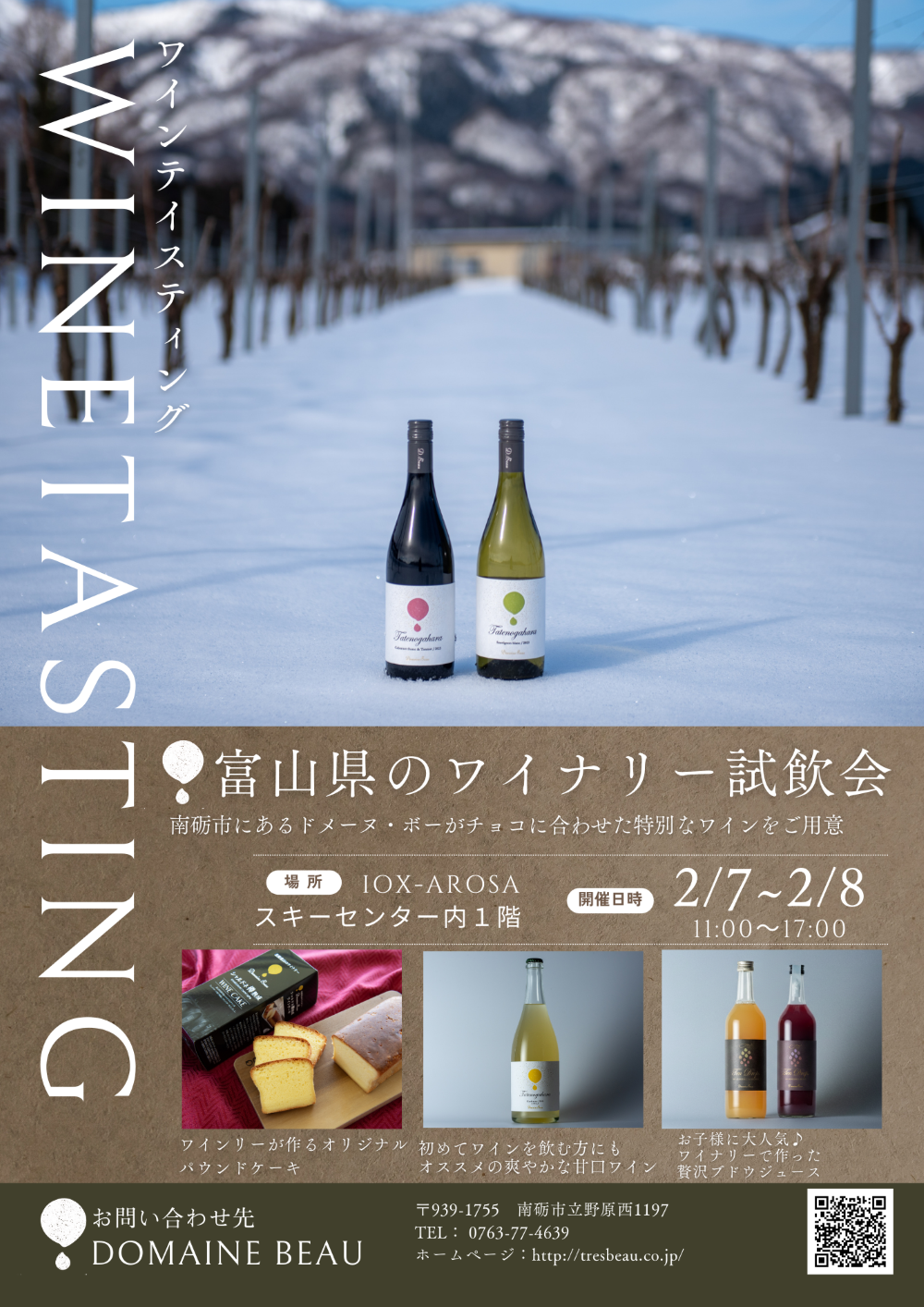 地元のワイナリー「トレボー」によるワインとぶどうジュースの試飲会🍇のご案内です。滑走の合間に、ランチ前にテイスティングしませんか。スキーセンター内ショップ前にて開催いたします。