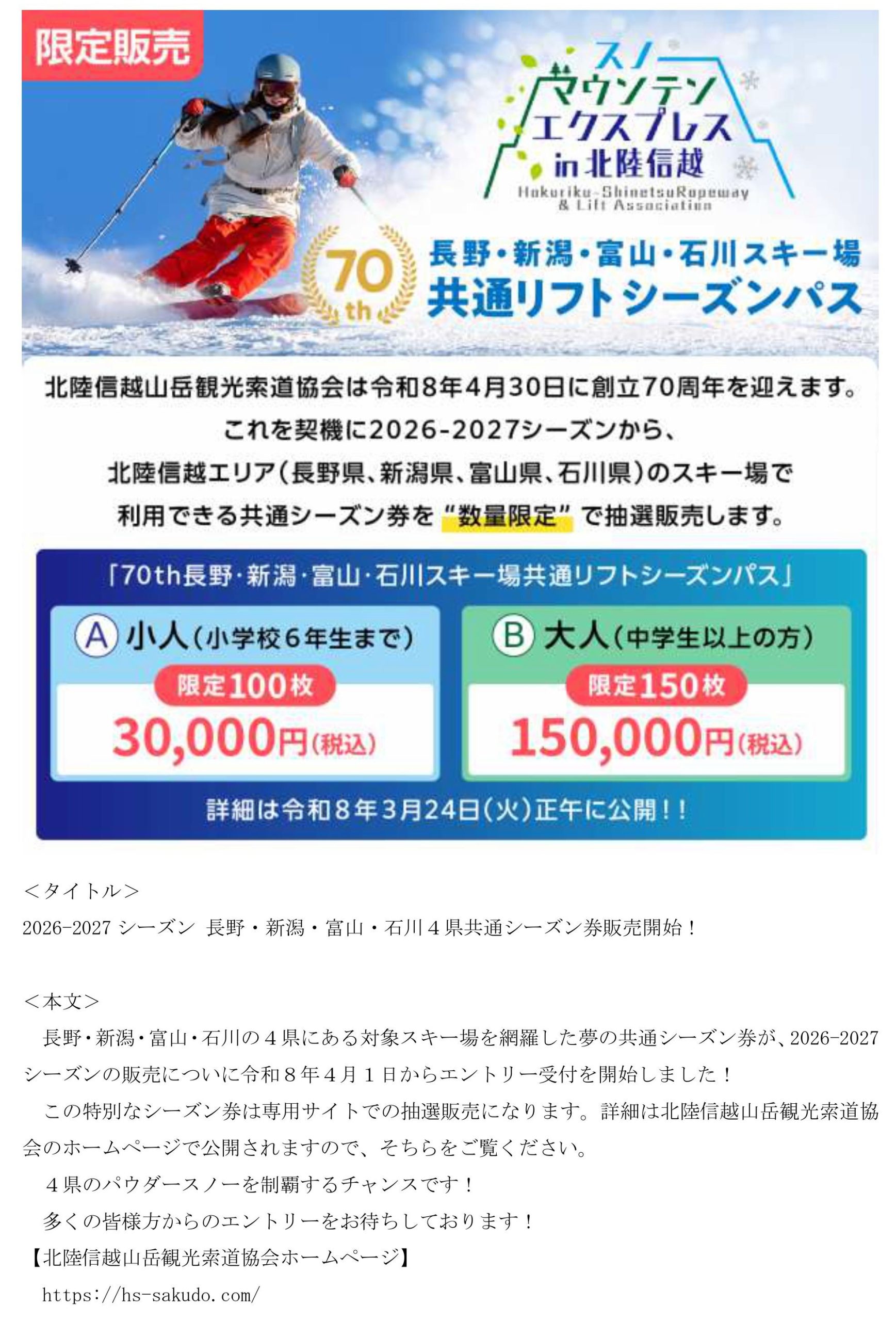 長野・新潟・富山・石川スキー場共通リフトシーズンパス